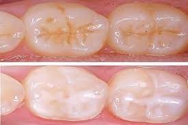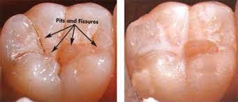 The tooth surface from the top is like a series of hills and valleys. This irregular surface is necessary for proper chewing of food, but even with regular brushing, these areas are susceptible to develop cavities. Pit and fissure sealants are materials that seal the depth of the irregular tooth surface, and form a protective plastic coating. They shield the grooves from food particles and bacteria and thus prevent tooth decay.